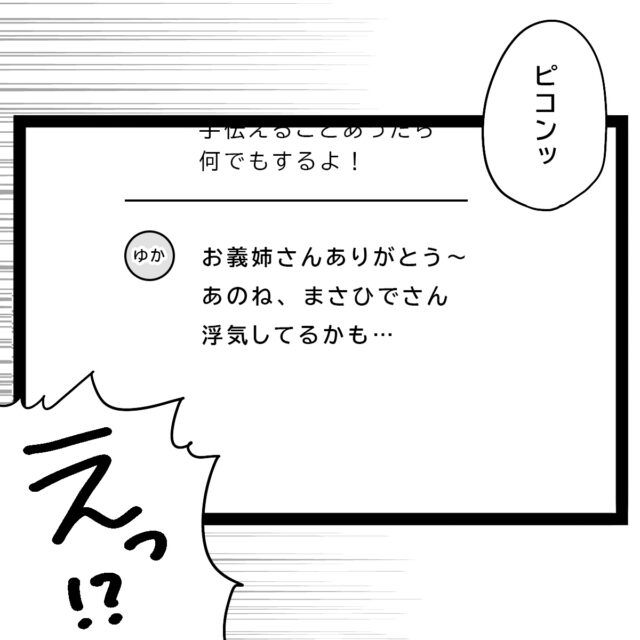 少しして「ピコンッ!」ゆかちゃんからの返信に気づいた雅美さん、そこには「お義姉さん、ありがとう~。あのね、まさひでさんが浮気してるかも・・」と書かれていて、突然のことに「えっ!?」と雅美さんは驚きました。