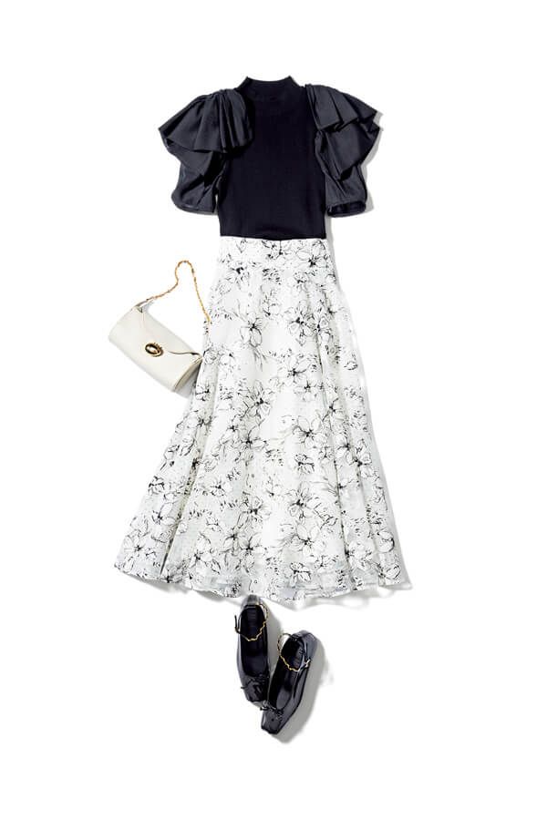 ボリュームのある立体的なラッフルスリーブも、ブラックカラーなら美人顔。コントラストを抑えた線画タッチの花柄スカートで、さらに大人っぽく仕上げて。