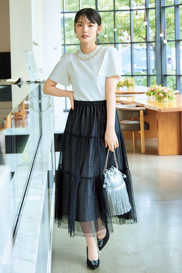ビジュー付きトップス×黒のドットスカートでパリシックな佇まいへ♡