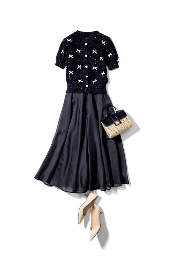 ラメ入りニットにリボンを配した、フェミニンエッセンス満載のカーディガン。全体的に黒の割合を多くすることで、リボンの甘さが目立ちにくく。