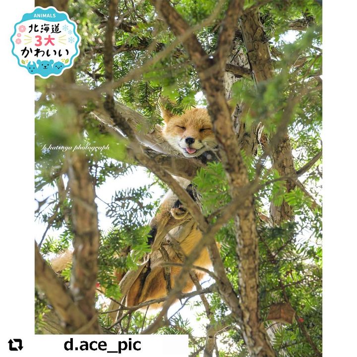ホームページにもこうあります「イソップ童話に出てくるきつねは、ブドウに手が届かなくて苦労しますが、きつねの中には木登りが得意な子もいるんです。得意どころか‥木陰が涼しくて気持ち良いのか、孤独癖があるのか、枝の上でぐっすり眠っていたりします」とあり、私も実際にここで「北きつねの木」に登っているキツネを見たことがあります。