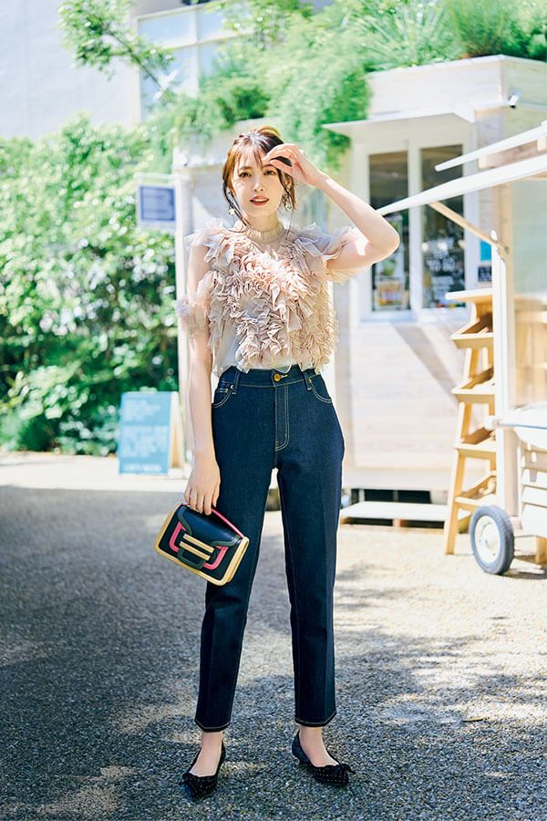3. デニムコーデがカジュアルすぎる…?旬の甘めチュールトップスを合わせて大人っぽく着こなして