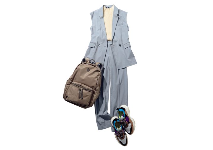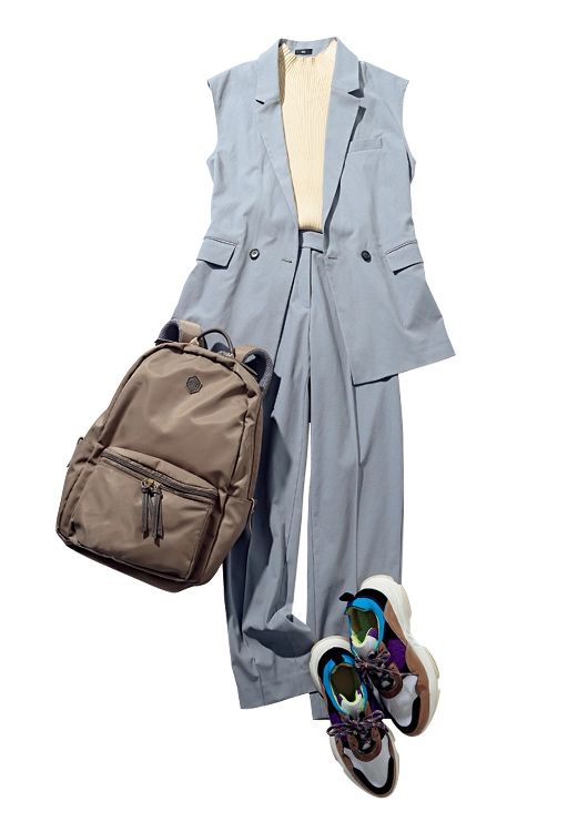 シアーニットセット(ノースリニット)¥23,100/ルーニィ ジレ×パンツSET(ジレ)¥17,000、ジレ×パンツSET(パンツ)¥12,000/PLST リュックサック¥15,950/ペルケ(アンビリオン) マルチカラースニーカー¥19,800/MANA
