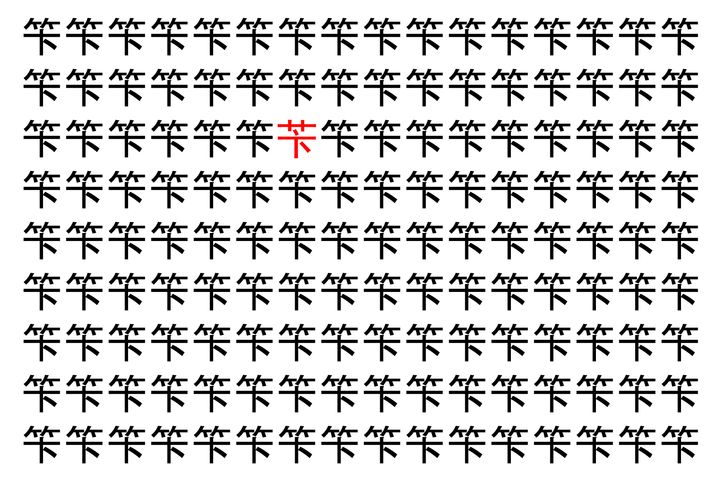 画像の中には、「笇」という漢字が縦に9行、横に16個並んでいます。 全部で144個となりますが・・・、そのうち1つは「異なる漢字」となってますよ!!
