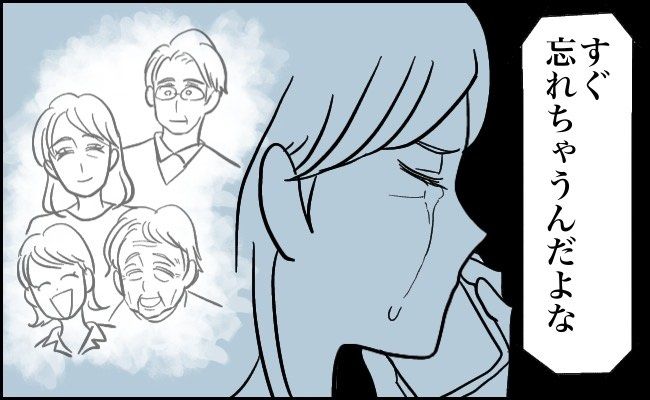 「せつなくて涙が出るんだけど」と言うと、兄はそれをそのまま母に伝えますが、母は「そうなんだよ、すぐに忘れちゃって切ないんだよ」と笑っていて、会話も的外れ。心配して電話をかけたことも、母の喜びそうなものを送ったことも、母はもう忘れているんだろうか。もしかしたら、母を喜ばせたくて新型コロナウイルスの前によく連れて行った旅行のことも、孫たちと一緒に過ごした思い出も、全部記憶から消えるのかもしれない……。そう思うと寂しさと虚しさが込み上げて、涙がこぼれました。