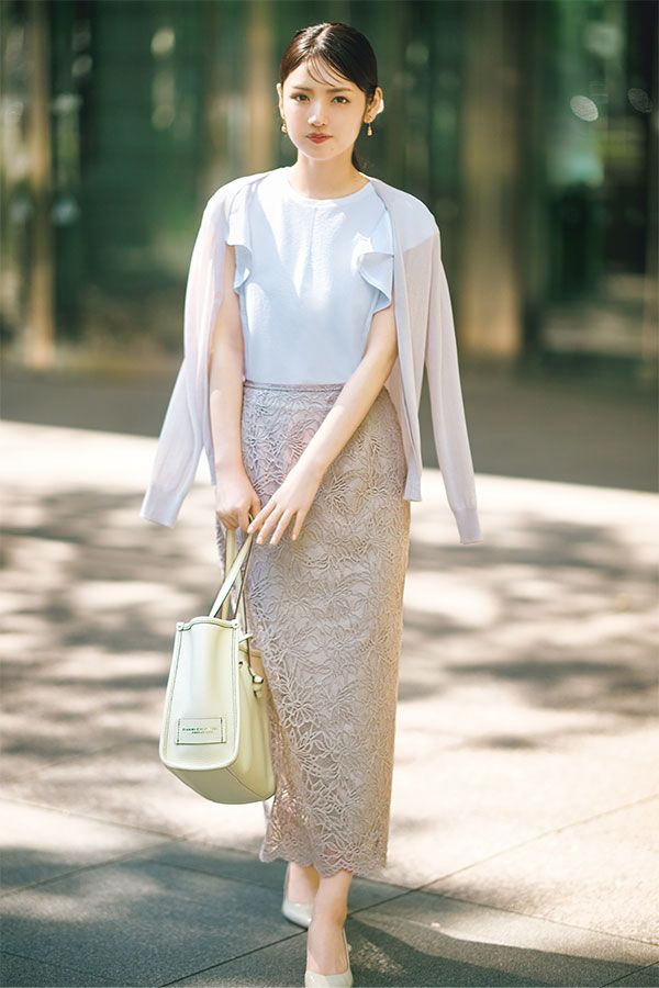 カットソー¥1,500、カーディガン¥2,990/ともにUNIQLO スカート¥10,890/PROPORTION BODY DRESSING イヤリング¥14,300/アンテプリマ(アンテプリマ 新宿髙島屋店) バッグ¥64,900/ジャンニ キアリーニ(ジャンニ キアリーニ 銀座店) 靴¥22,000/モード エ ジャコモ(オギツ)
