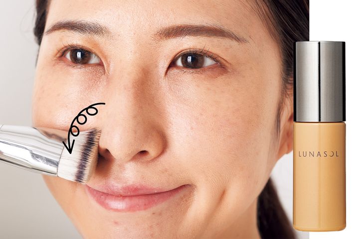 始めからブラシで塗ると、ブラシがファンデを吸ってしまうので、手で軽く塗った後、ブラシで塗るのが正解。小鼻周りはくるくると。