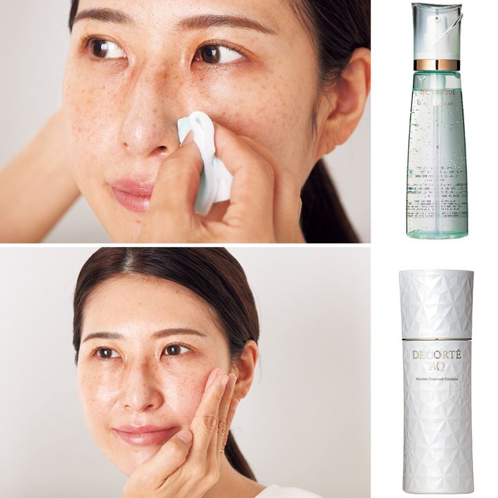 下地前にスキンケアが肌になじんでいる状態がベスト。手早く拭き取り後、気になるところはコットンで、くるくる巻き上げるように。さらに保湿力の高い拭き取り先行乳液を手で入れ込む。