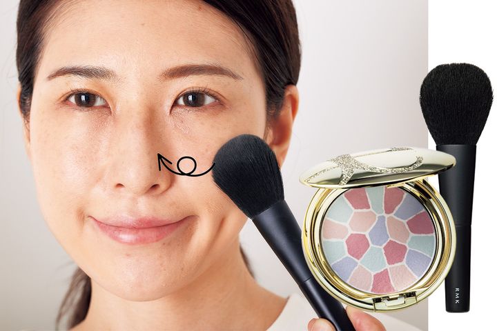 パウダーをブラシにしっかり含ませた後、余分な粉を落とし、軽くつける。さらに毛穴が目立つ頰には、ブラシを寝かせ、転がすように塗る。