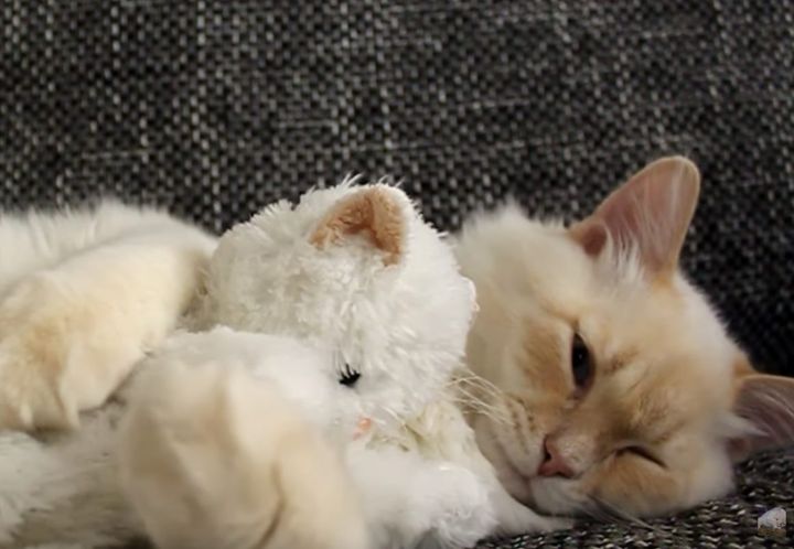 「この子と寝るニャ」テディベアをギュッと抱きしめて眠る猫。