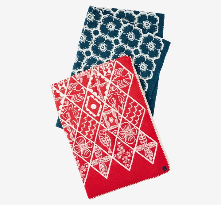 穏やかなテキスタイルに心が和む〈ミナ ペルホネン〉のブランケット。今年は花模様の”アネモネ”、森の住人たちと植物が描かれた”シンフォニー”など4柄に、レッドやブルーグリーンなどの新色を加えたラインナップ。良質な糸で織られた程よい厚みのウール生地は、肌触りが滑らかで、体を優しく包んでくれる。インテリアのアクセントにも。