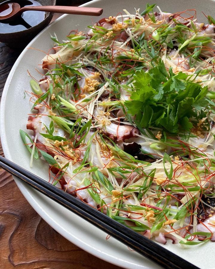 ごま油とにんにくを弱火にかけ、にんにくを焦がさないようにカリカリに仕上げた香味油がおいしさを引き立てる、蒸しタコの中華風カルパッチョ。ポン酢をかけて召し上がれ。
