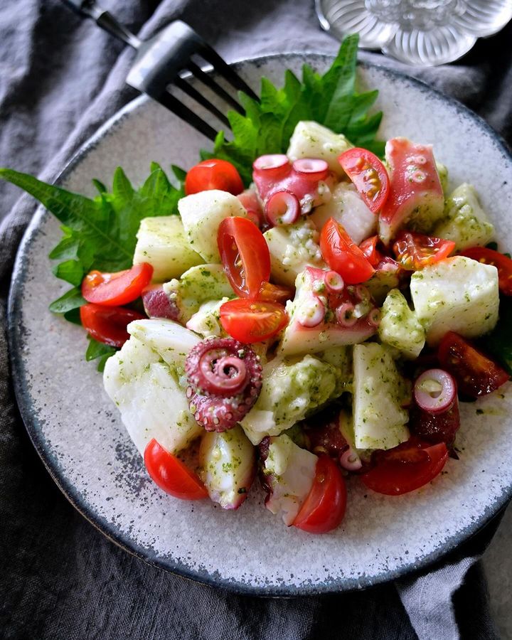 小さめにカットしたタコに長芋とトマトを合わせた、暑い日にぴったりな冷製おつまみ。