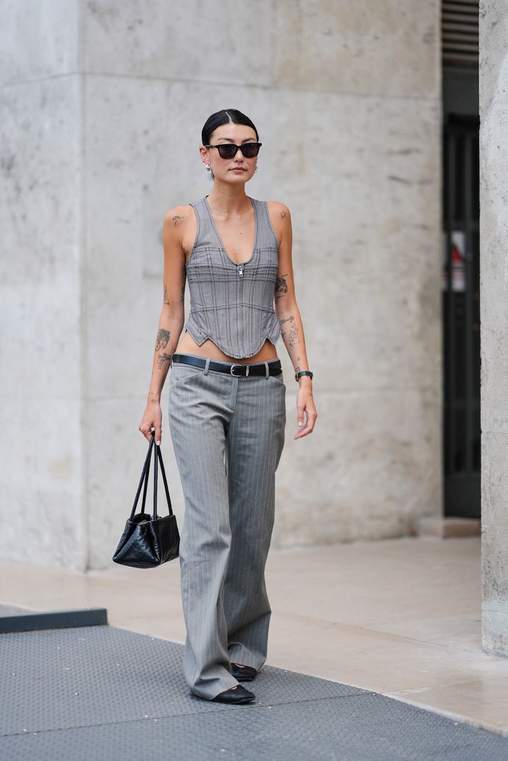 ボディにフィットしたコルセット風のミニ丈なら、エッジィな雰囲気に仕上がる。ピンストライプのマニッシュなパンツを合わせクールに見せて。