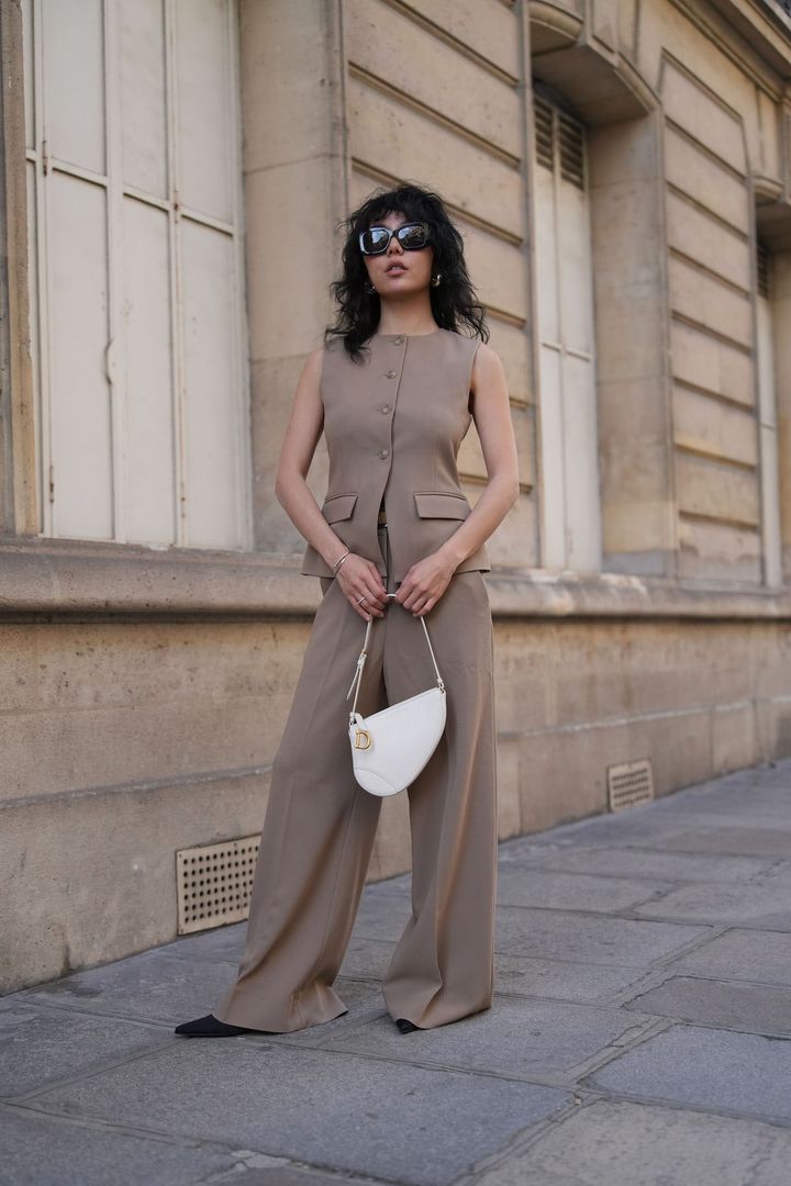 デイリーはもちろん、フォーマルなシーンで大活躍するのがセットアップだ。ベージュをチョイスすれば、女性らしさもこなれ感もアピールできる。サングラスやバッグ、アクセサリーで自分らしいアレンジを加えよう。