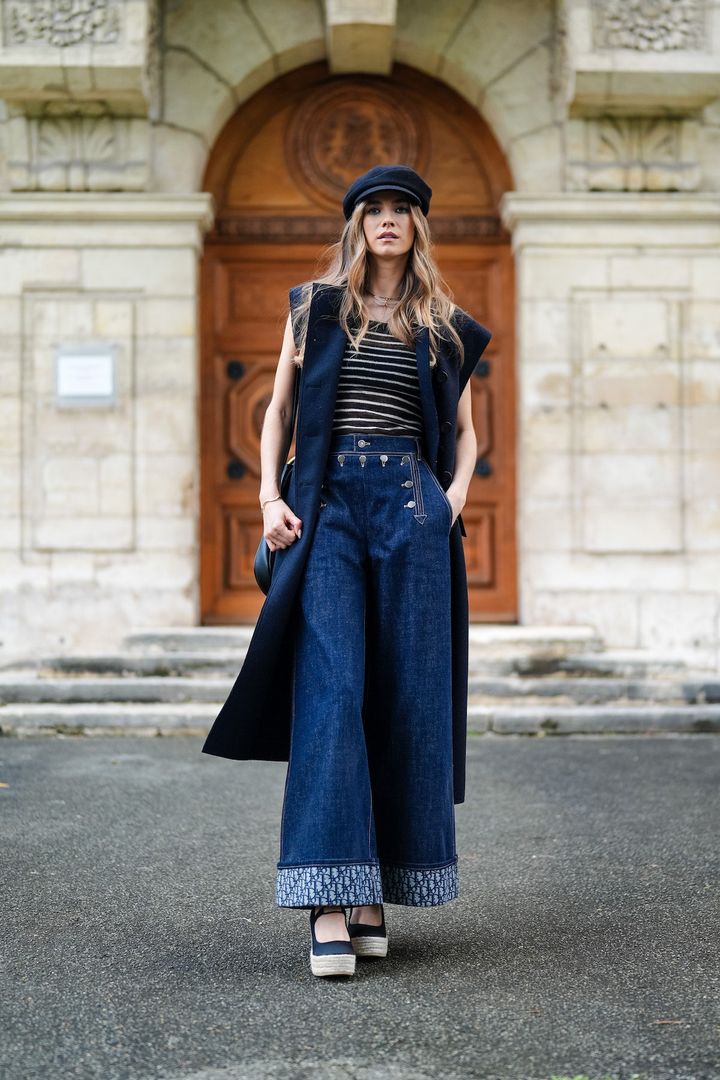 軽めのアウターを羽織って、秋スタイルを楽しみたい人にはロングジレをレコメンド。ボーダーのトップ、デニムのフレアパンツ、そしてキャスケットを合わせれば小粋なマリンスタイルが完成。