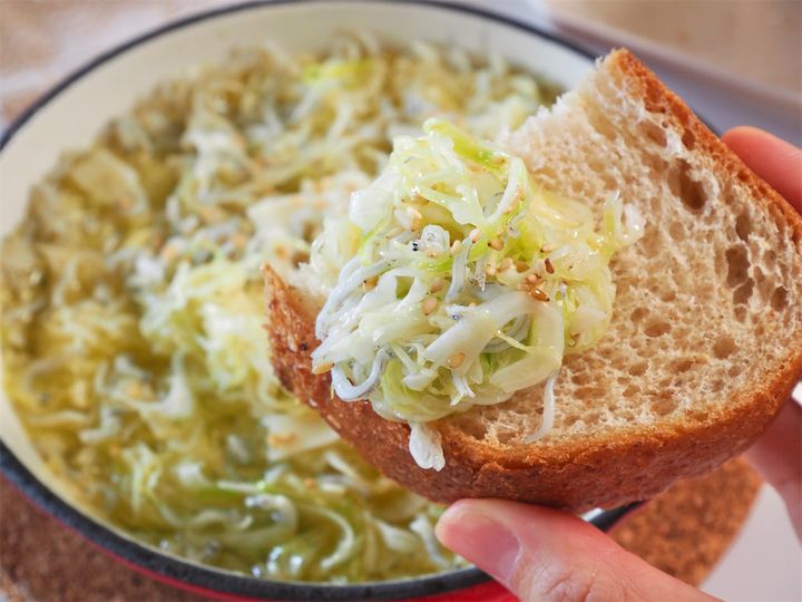 おいしいオイルを存分に楽しむため、米粉パン(分量外)を添えてみました♪これぞアヒージョというにんにくの香りがたまらない。食べてみると、キャベツはしゃきしゃきとした食感が残っています。甘みと酸味のバランスのいい味付けが、しらすの旨味を引き立てている!咀嚼するほどにキャベツの甘み、浅漬けの素ならではの風味を感じるのがまた味わい深い。白いりゴマを噛むとふわっと香ばしいポイントになって、なんとも華やかな印象です。これらの食材の旨味がたっぷり移ったオリーブオイルを浸して食べるのがおいしいんですよね♡キャベツは短めに切ると食べやすいかも!