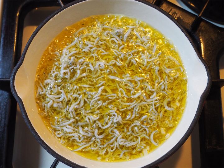 油たっぷりなので、茹でているような感覚!炒め時間は明記されていなかったので、しらすのおいしさがオリーブオイルに移るように想いを込めながら1分ほど炒めました。