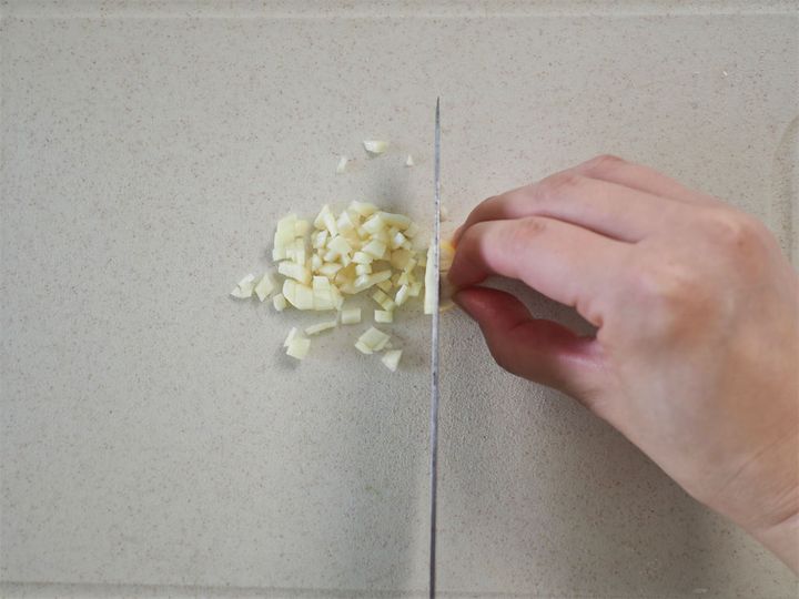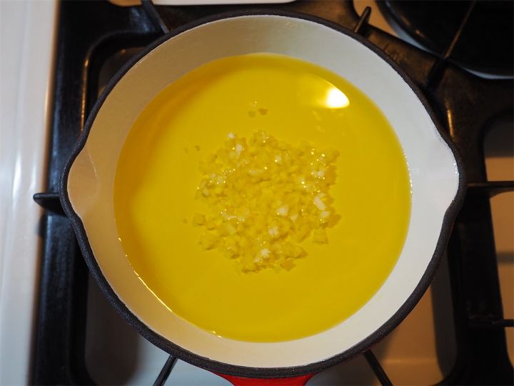 4. スキレットにオリーブオイル、1のにんにくを入れ弱火にかける。