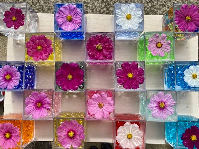 本堂に近づくと、人だかりを見つけることができます。コスモスのシーズンは、本堂の前にコスモスグラスキューブが飾られその様子が本当に可愛い! 四角の入れ物に収まるコスモスが本当にキュートです。私が訪れたときは、推しのアイドルやキャラクターのアクリルスタンドと一緒に撮影している方が多くいらっしゃいました。サイズ感としてもピッタリなので映えるのかもしれません。