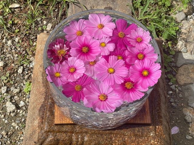 また、美しいのが手水舎。手を清める場所に花を浮かべることを「花手水」と呼びますが、そこがコスモスで満たされます。ピンク色のコスモスが浮かぶ姿を見るだけで、気持ちが華やかになるのは本当に不思議です。アジサイの季節には、同じくアジサイが敷き詰められることでも人気。アジサイは青や紫の色味があるのでコスモスとはまた異なった景色を楽しむことができますね!