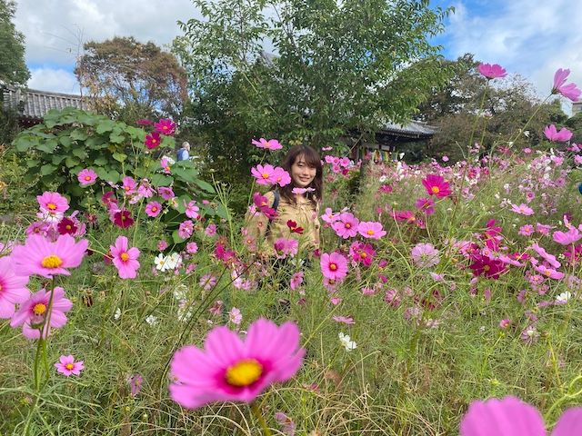 コスモスは1〜2mまで背が高いのも特徴。だからこそ、コスモスの中に迷い込んだ写真も撮りましょう。さらに写真だけでなく般若寺の特徴としてコスモスをかたどった御守りがあるそう! 写真だけでなく、記念もコスモスだらけに浸ることができます。