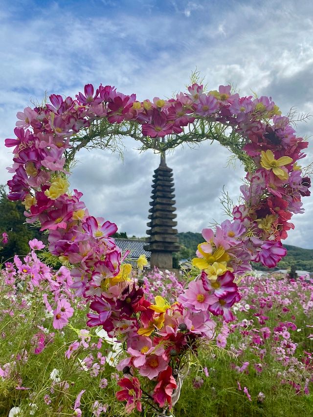 本堂を眺められる位置にハート型の花のリースが!ハートの中に入って記念撮影することもできますし、ハート越しのお寺や十三重石塔の撮影もおすすめ! こちらも写真スポットになっています。