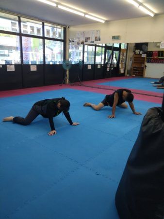 今回はマンツーマンで体験させていただきました。 まずは、準備体操。柔軟体操に、2分間のジャンプ(縄跳びの縄なしバージョン)。