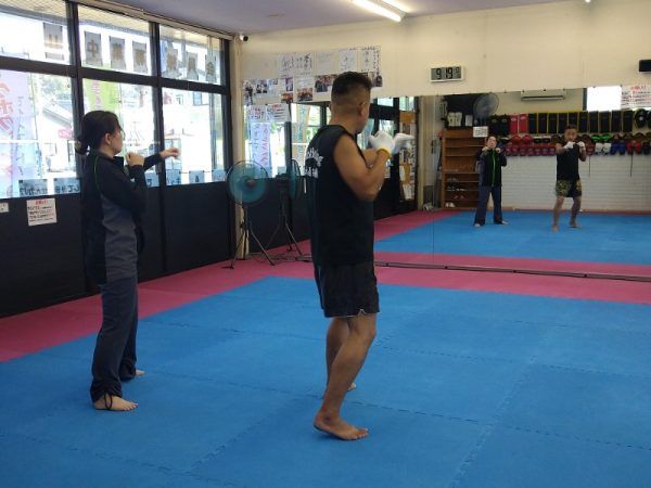 そして、大型鏡の前でパンチの打ち方のご指導。向かい合うと左右逆だから分かりにくいですもんね。鏡をみながらやることで自分の全身の動きも見えるからやりやすい。 この時点で、「お、頑張っているね、私」って自己肯定感も爆上がりです。
