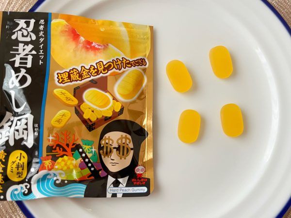 大人気忍者めしシリーズから小判型のハードグミが登場。その食感はまるで鋼のように固く、クセになります。噛めば、噛むほどジューシーな黄金桃の味わい。