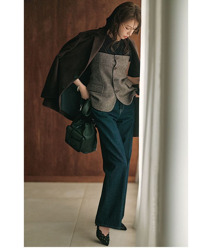 ベロアトップス¥17,600(ロンハーマン)ツイードビスチェ¥15,400(スピック&スパン/スピック&スパン ルミネ有楽町店)ジャケット¥198,000(ATON/エイトン青山)デニムパンツ¥39,600(エブール/LITTLE LEAGUE INC.)バッグ¥193,600(ピエール アルディ/ピエール アルディ 東京)靴¥195,800(セルジオ ロッシ/セルジオ ロッシ カスタマーサービス)バングル¥13,750(エイチアッシュ/フォーティーン ショールーム)