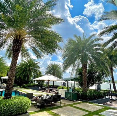 エントランスの先にはサイゴン川の手前まで伸びるプールと青空に映える椰子がリゾート気分を盛り上げ、ホーチミン市内とは思えない非日常感に誘われます。