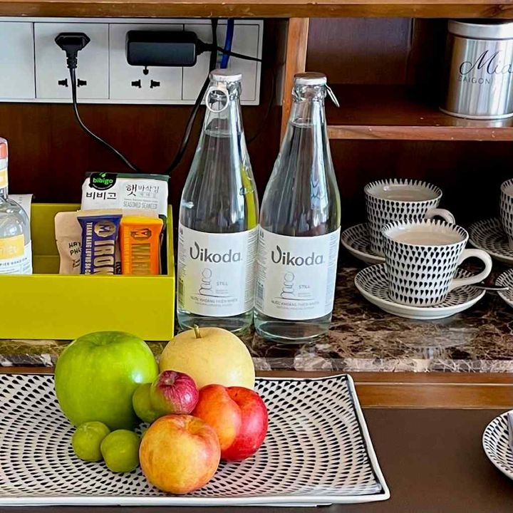 デスクもあるので美しい景色を見ながらのワーケーションも捗ります。椅子の多さや配置もちょうど良く、ウェルカムフルーツや飲み物も充実した居心地抜群のお部屋でした。