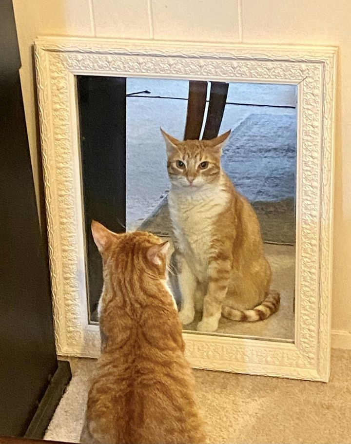 自分よりも大きな鏡を前に、すました顔をしているようにも見えるトラ子ちゃん。鏡に映る自分を見るというのは人間だと当たり前のことですが、猫にとっては決して当たり前ではないはず。鏡の中にいる美しい猫に対して、どんな気持ちでいるのでしょうか。