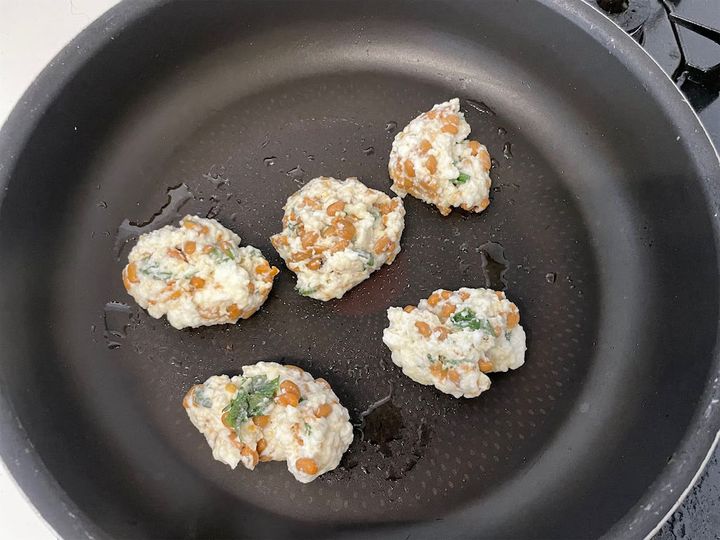 3. 冷蔵庫にあるもので即!「納豆とはんぺんのふわふわ焼き」に挑戦♪青じその爽やかな薫りが広がる~♡