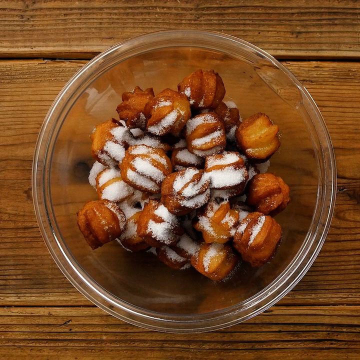 6: 油をよく切り、熱いうちにグラニュー糖をまぶして完成です。
