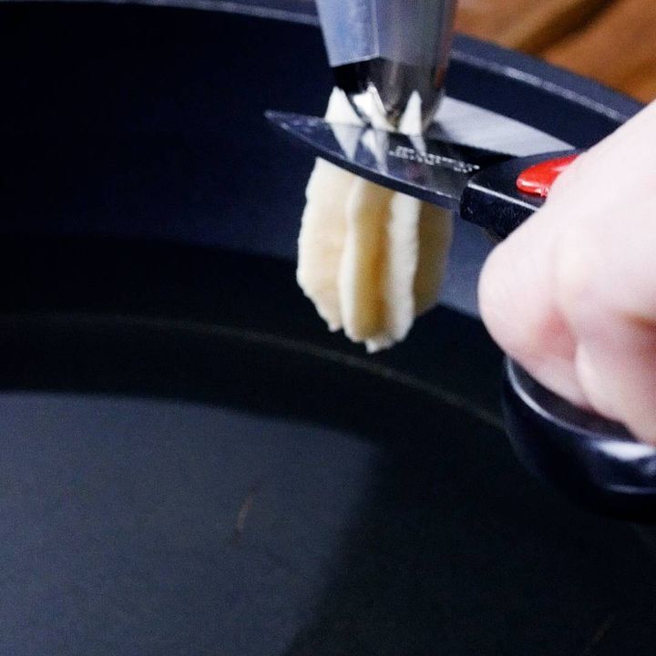 4: フライパンにサラダ油を入れ170℃に熱し、③をひと口大に絞りハサミで切りながら入れます。