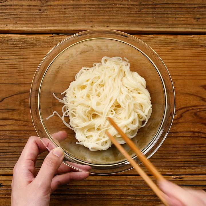 1: ボウルにそうめん、オリーブオイル、塩を入れてほぐしながら混ぜます。