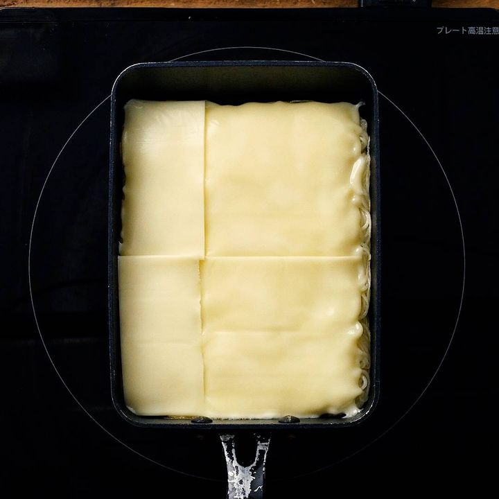3: スライスチーズをのせ、少し溶けたら裏返します。