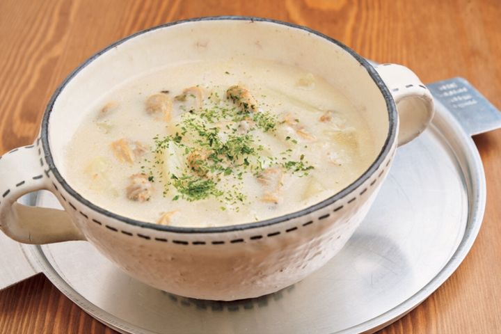 あさりの水煮缶の汁まで使うことで、海の香りを最大限に引き出し、じゃがいもを煮込んだとろみでクリーミーな味に。