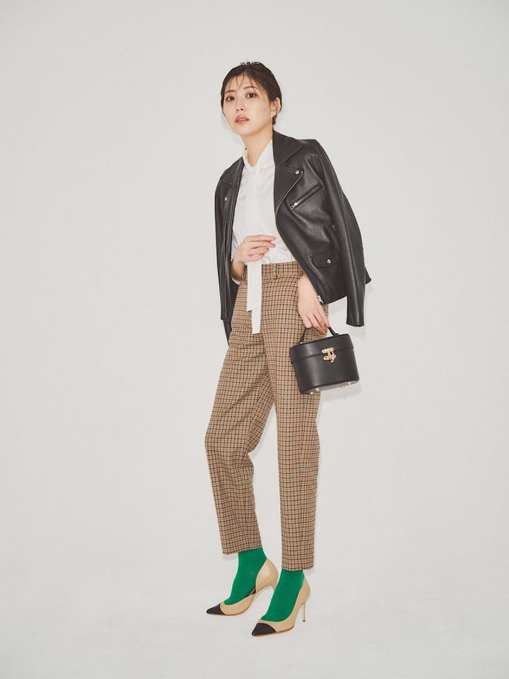 きちんと感が漂うレトロな着こなしに、実はベージュと相性のよいグリーンのソックスを投入。遊びの効いたアクセントが、鉄板の秋コーデを一新します。パンプスのつま先やライダースなど、ところどころに黒を散りばめておけば、カラーソックスが幼く見えません。ソックス¥429(コンビニエンスウェア/ファミリーマート)ジャケット¥49,500ブラウス¥23,100(ともにデミルクス ビームス/ビームス 公式オンラインショップ)パンツ¥12,100(シップス エニィ/SHIPS インフォメーションセンター)バッグ¥11,000パンプス¥29,700(ともにツル バイ マリコ オイカワ)イヤカフ¥6,380(イン ムード/フォーティーン ショールーム)