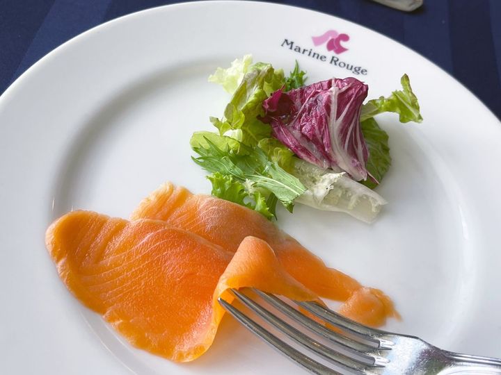 最初にサーブされたオードブルは「スモークサーモンとエンダイブなどのサラダ添え」。サーモンの燻製の香りが食欲をそそります。