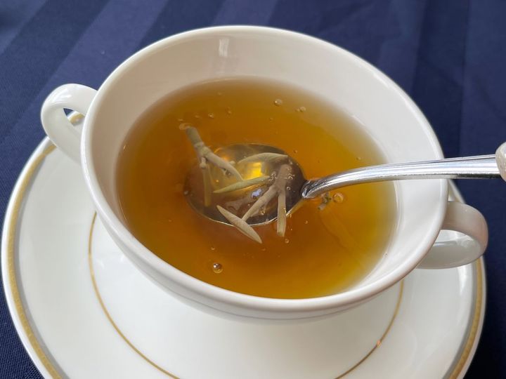 スープは「冷製コンソメスープ シェリーの香り」。ジュンサイが浮いたビジュアルが涼やかです。