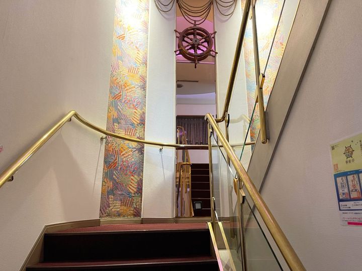 舵輪がシンボリックに配置された階段を上って2階へ。