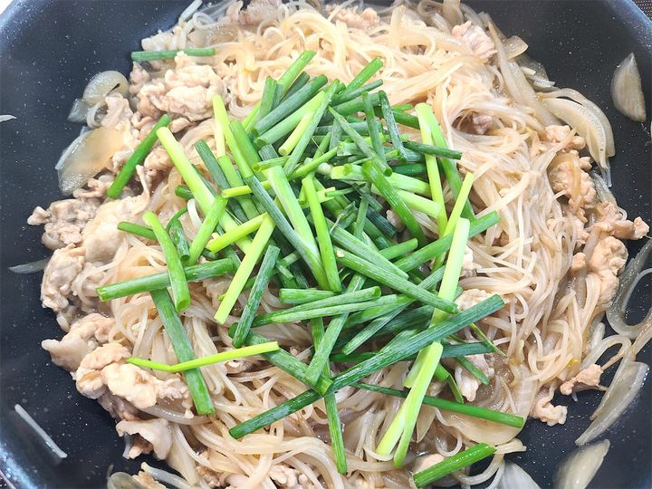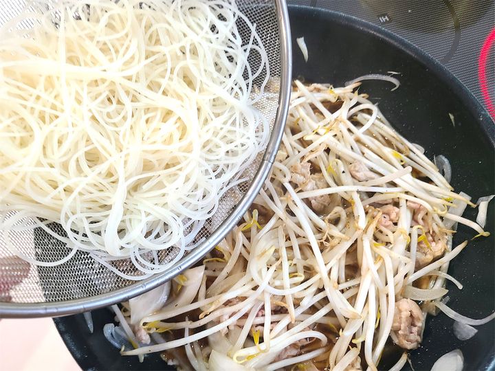 7. 沸騰したらビーフンを入れ、水分がなくなるまで炒めます。