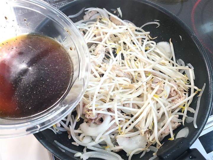 6. フライパンにサラダ油大さじ1(分量外)を加えて中火で熱し、3の豚肉、玉ねぎを炒めます。少し炒めたら、もやしを加えてさっと炒め、合わせておいた5のタレを加えます。