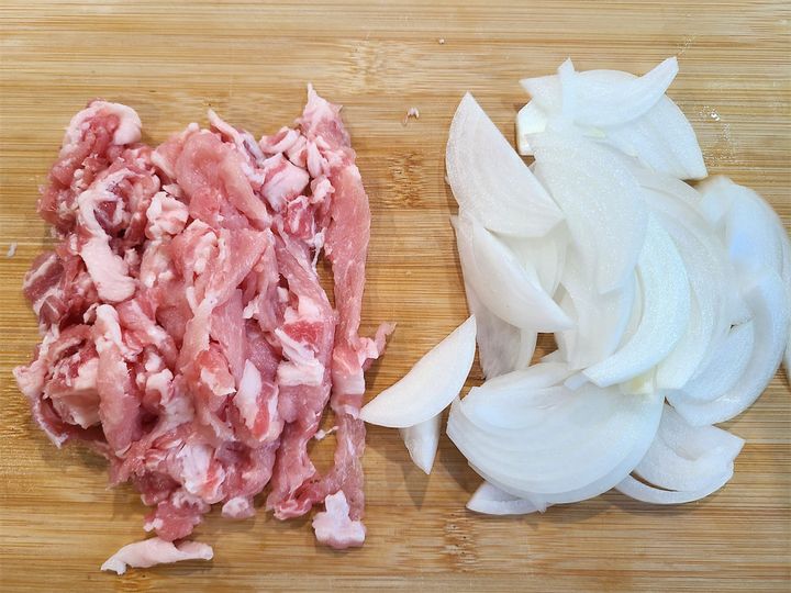 3. 玉ねぎを薄くくし切りにし、肉も細切りにします。