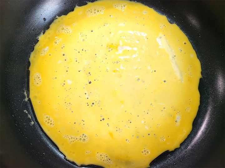 2. フライパンに油を入れ中火で熱し、卵を薄焼きにします。粗熱をとったあとに少し太めの細切り(短冊切り)にします。