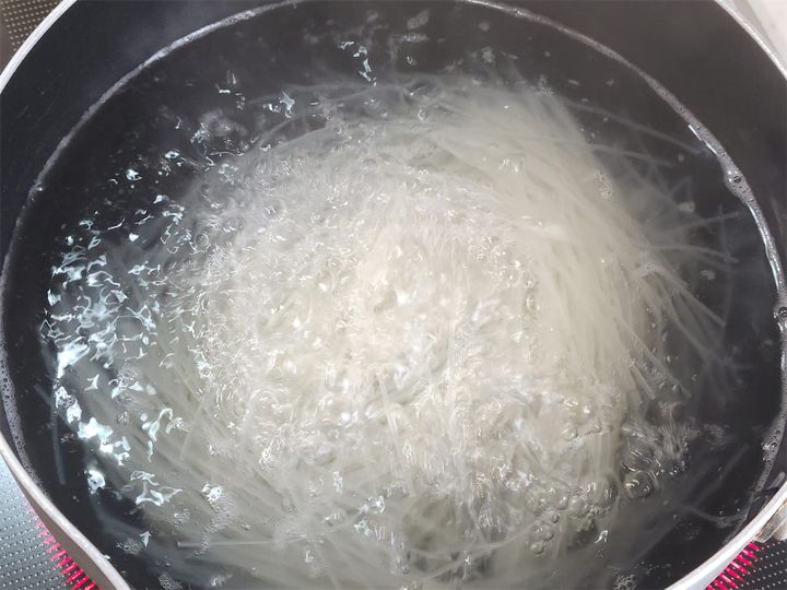 4. 1で沸かしたお湯にビーフンを入れ、1分ほど茹でます。あとで炒めるので固めでOKです。茹で上がったらザルにとり、水でぬめりと粗熱をとっておきます。ビーフンが長い場合はキッチンばさみなどで切っておきます。最後にゴマ油を加えて和えておくとくっつかずにうまく炒められます。
