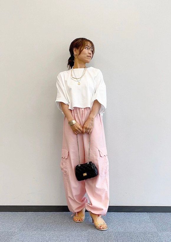 ピンクを着用。彩度高めなピンクが女性らしいアイテムです。ほのかに落ち感があるので着痩せして見えるのも嬉しい。撥水素材を使用しているので夏のゲリラ豪雨対策にもおすすめ♪